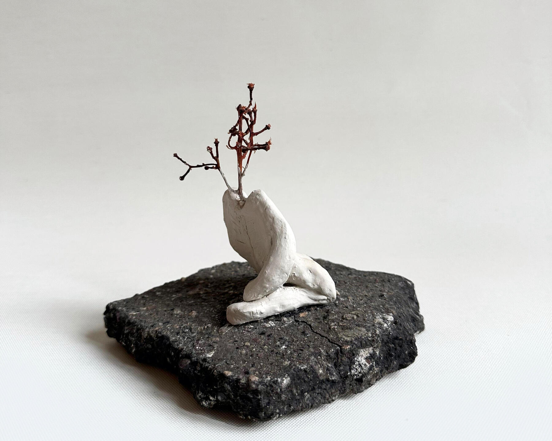 Raw ceramic, dry flower and stone - 10x10x15 cm